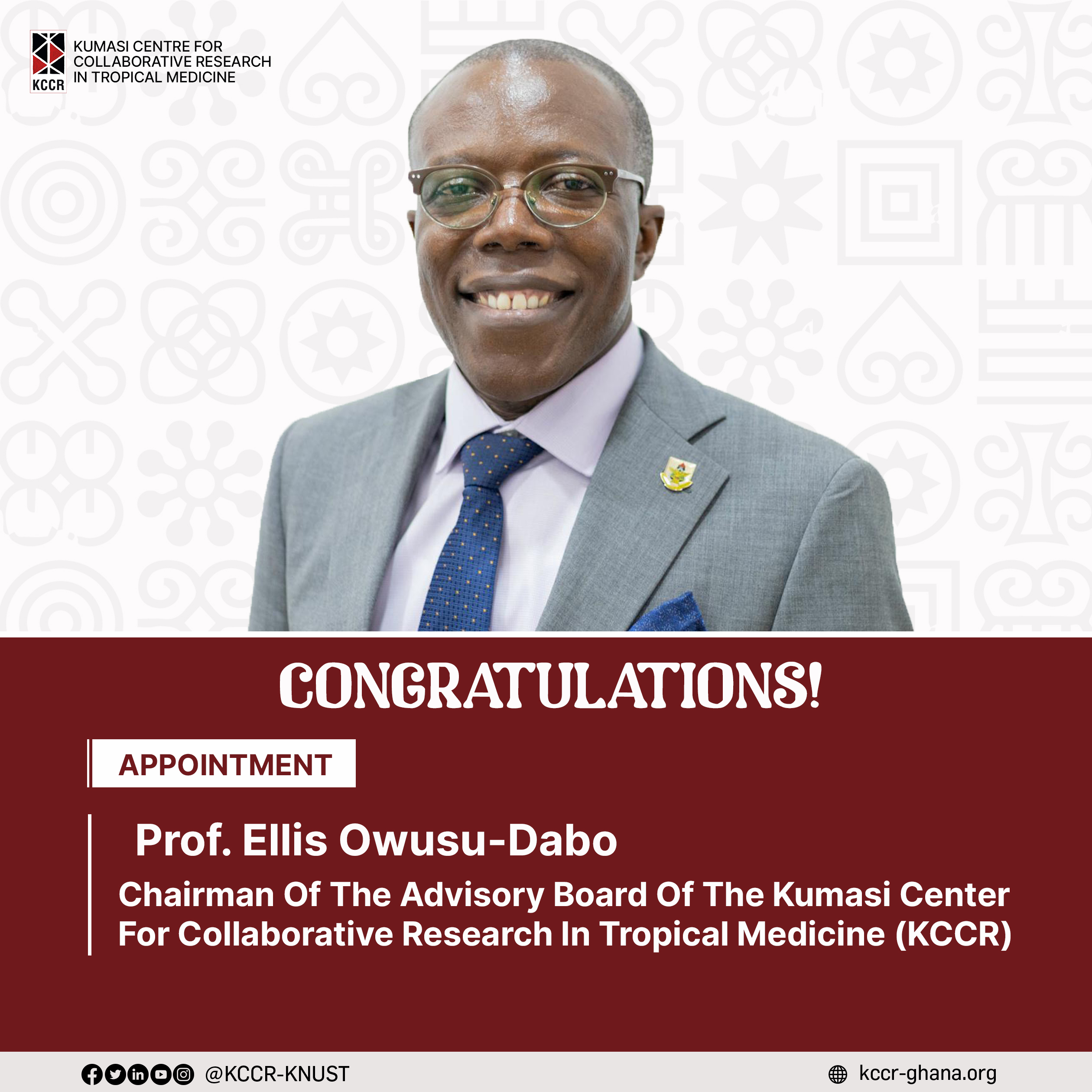 The Kumasi Centre for Collaborative Research in Tropical Medicine (KCCR) is pleased to announce Professor Ellis Owusu-Dabo as its new Advisory Board Chairman, appointed by the Health Minister Hon. Kwabena Mintah Akandoh, effective March 1, 2026, for a four year term. A distinguished medical doctor, epidemiologist, and Professor of Global Health at the Kwame Nkrumah […]